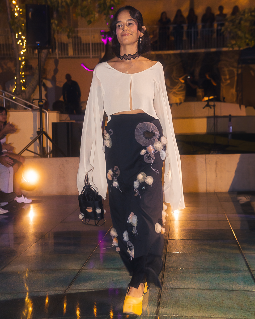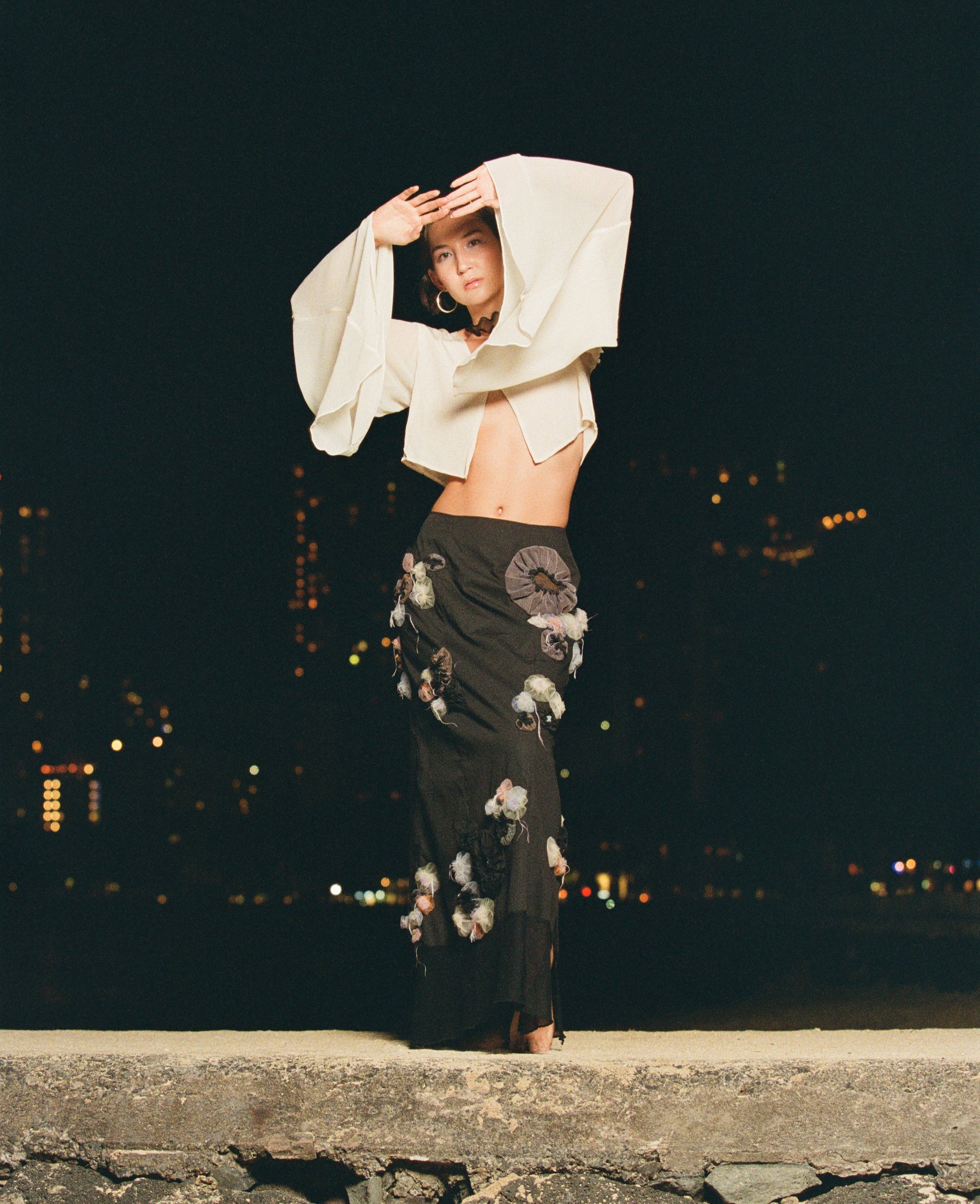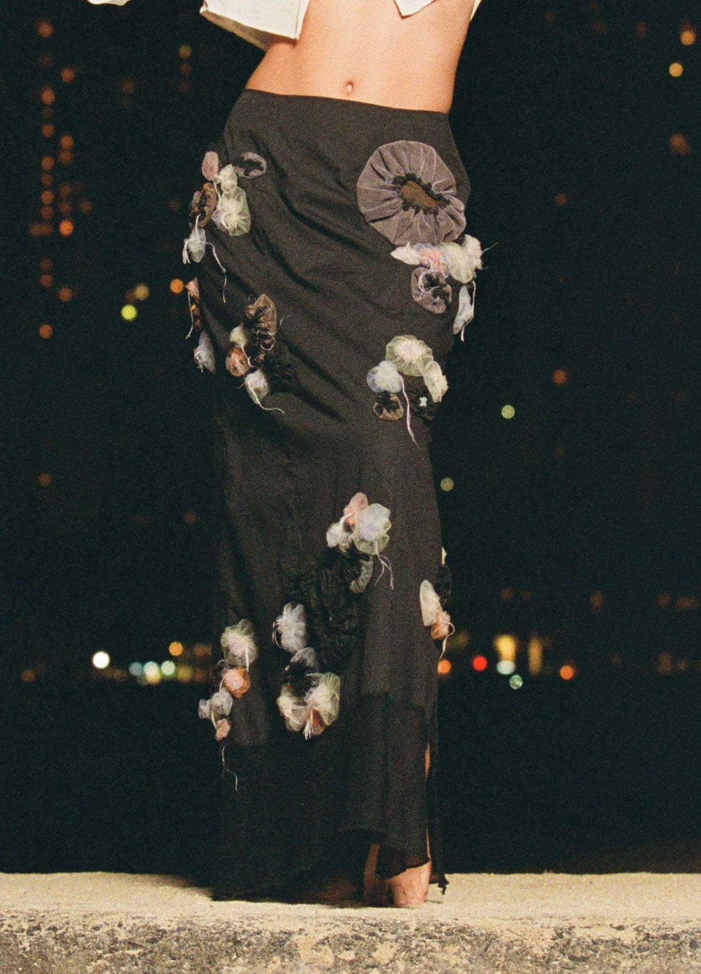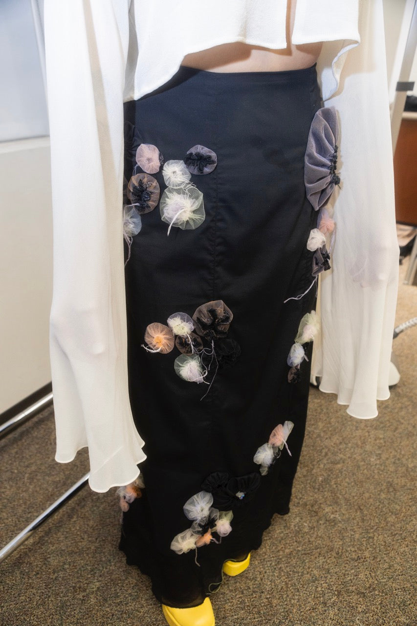 The Bioluminescence Reefs maxi skirt brings the ocean to life with a vivid, three-dimensional print of anemones and brain corals. Hidden among the anemones, tiny clownfish eggs made of iridescent frosted glass catch the light with every step. Designed with flowing panels and a wide side opening, this skirt moves effortlessly with you. A sheer velour hem, finished with a delicate lettuce edge.