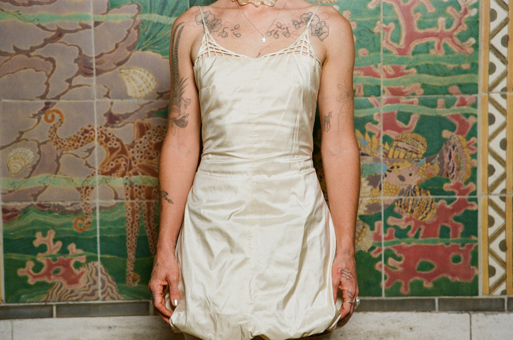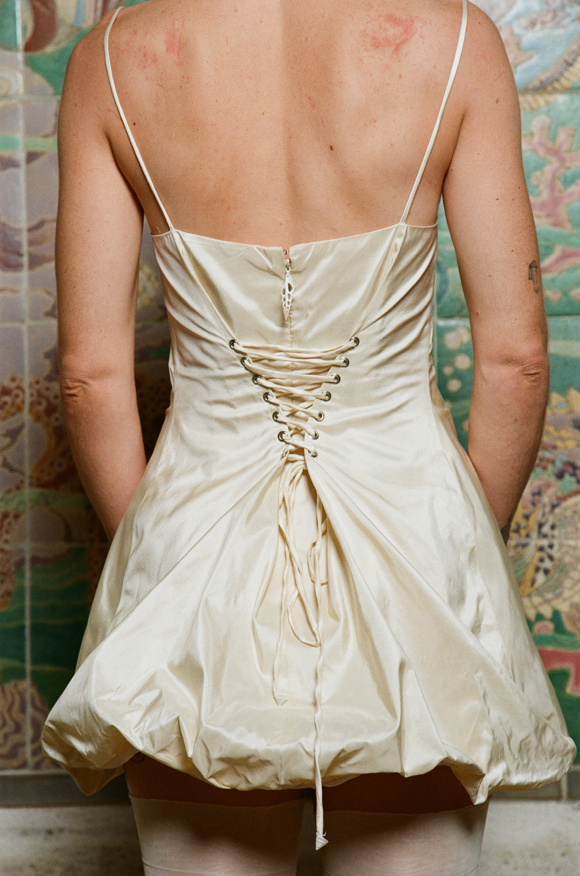 The Burbuja Dress is a crafted garment with a half-parabola (mesh) design on the front. It boasts a corset closure and a ribbon with Tectus Niloticus (sea shells) as the strap ends. The dress also includes a back zipper closure with a Spire (sea shell) zip and a bubble hem design.