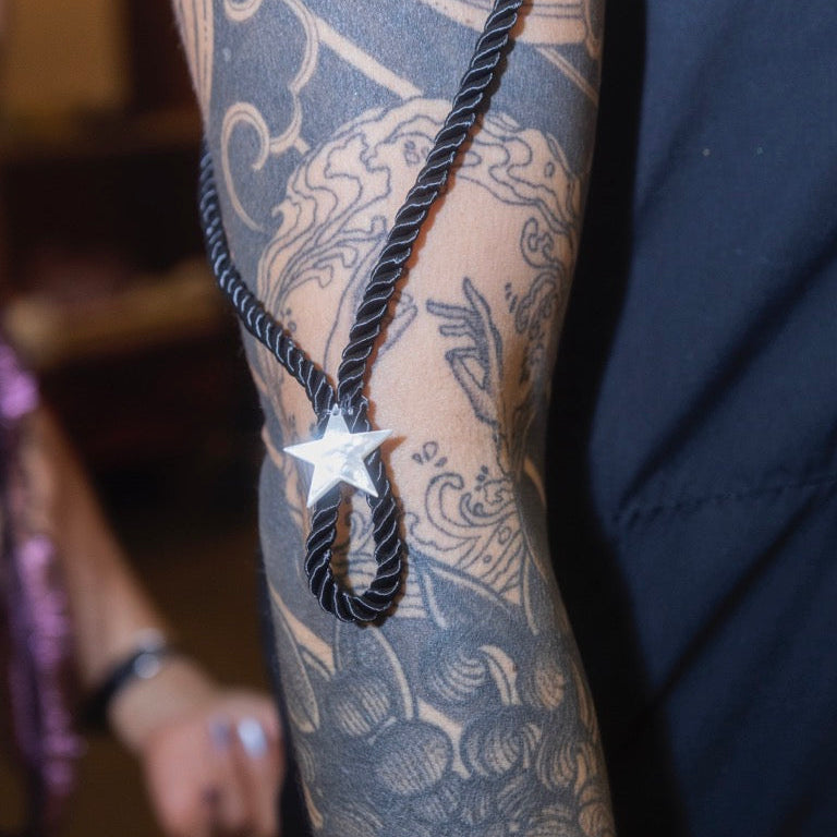 This black halter dress showcases a pointed front opening, star-shaped cutouts at the waist, and intricate zigzag topstitching. The statement piece is completed with a long velvet cord that drapes beautifully over the neck and shoulders, embellished with mother of pearl accents on each end.